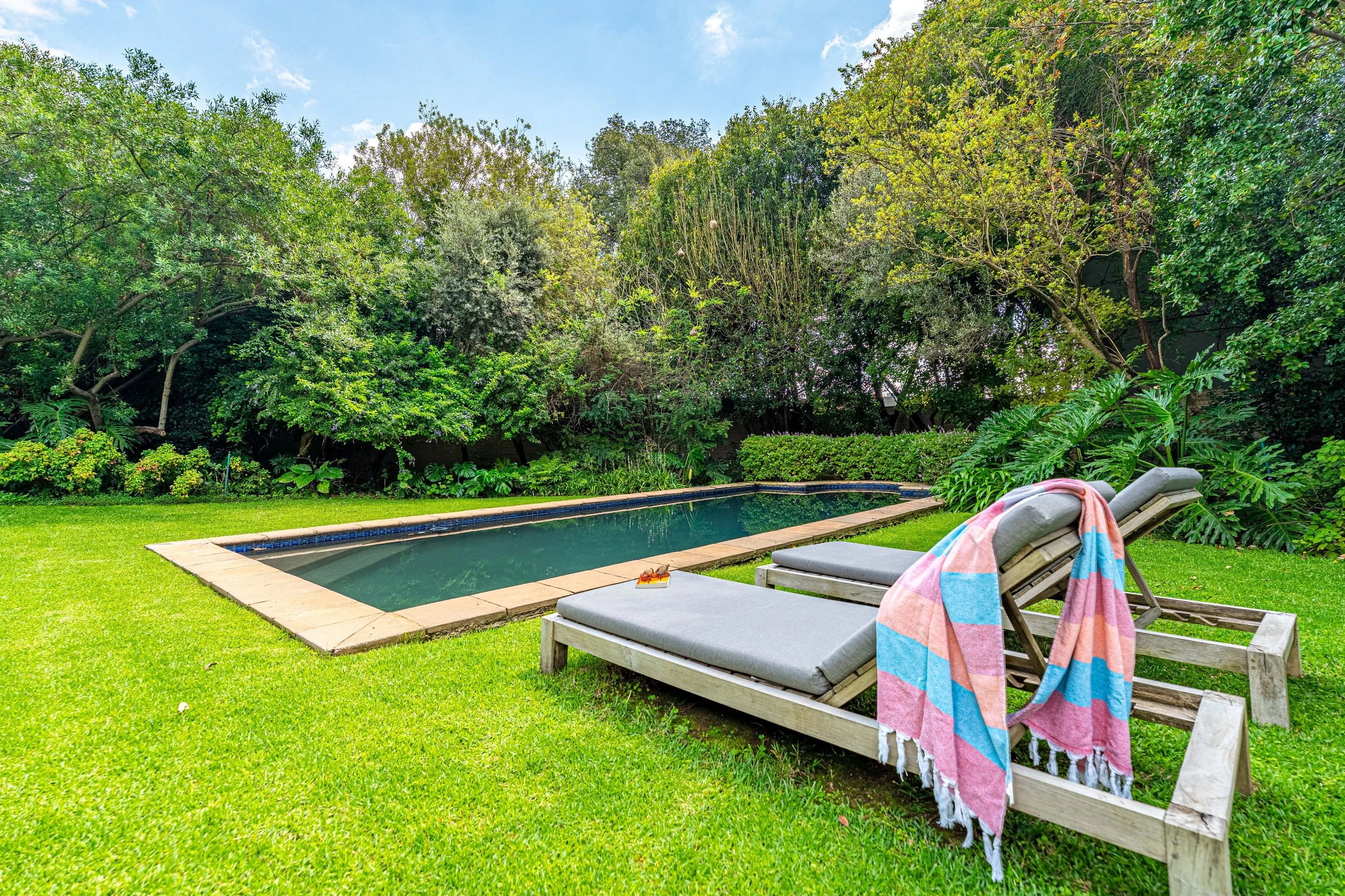It’s outside where the home really comes alive. Doors lead onto a large covered stoep (patio) to ensure you maximise the 365 days of Joburg sunshine. With an outdoor lounge and dining area overlooking the pool and garden. This is where life happens: long lunches, relaxed braais, and kids moving between the pool and garden all day.