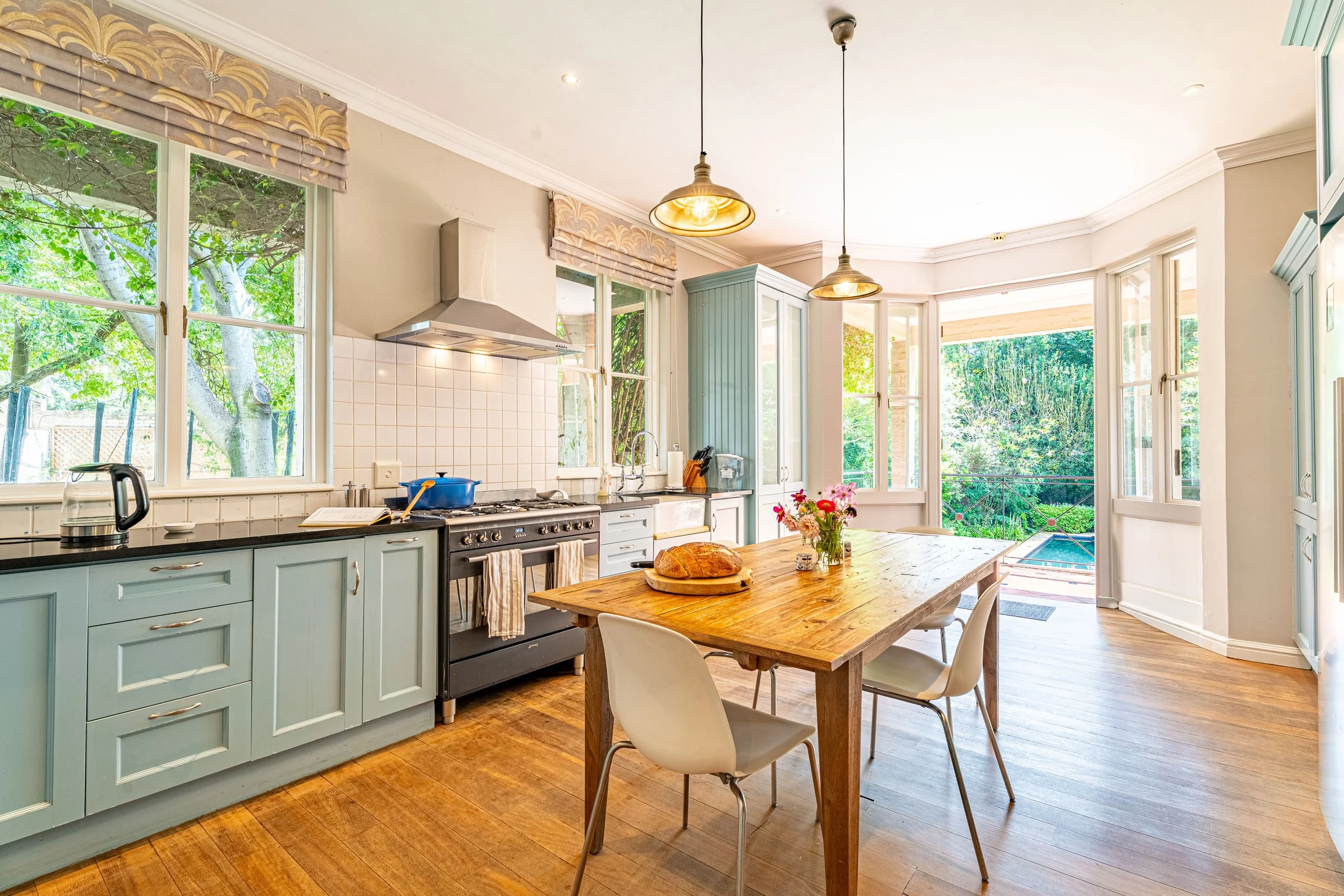 The additional bedrooms are light-filled and generous, with bay windows and leafy views.
