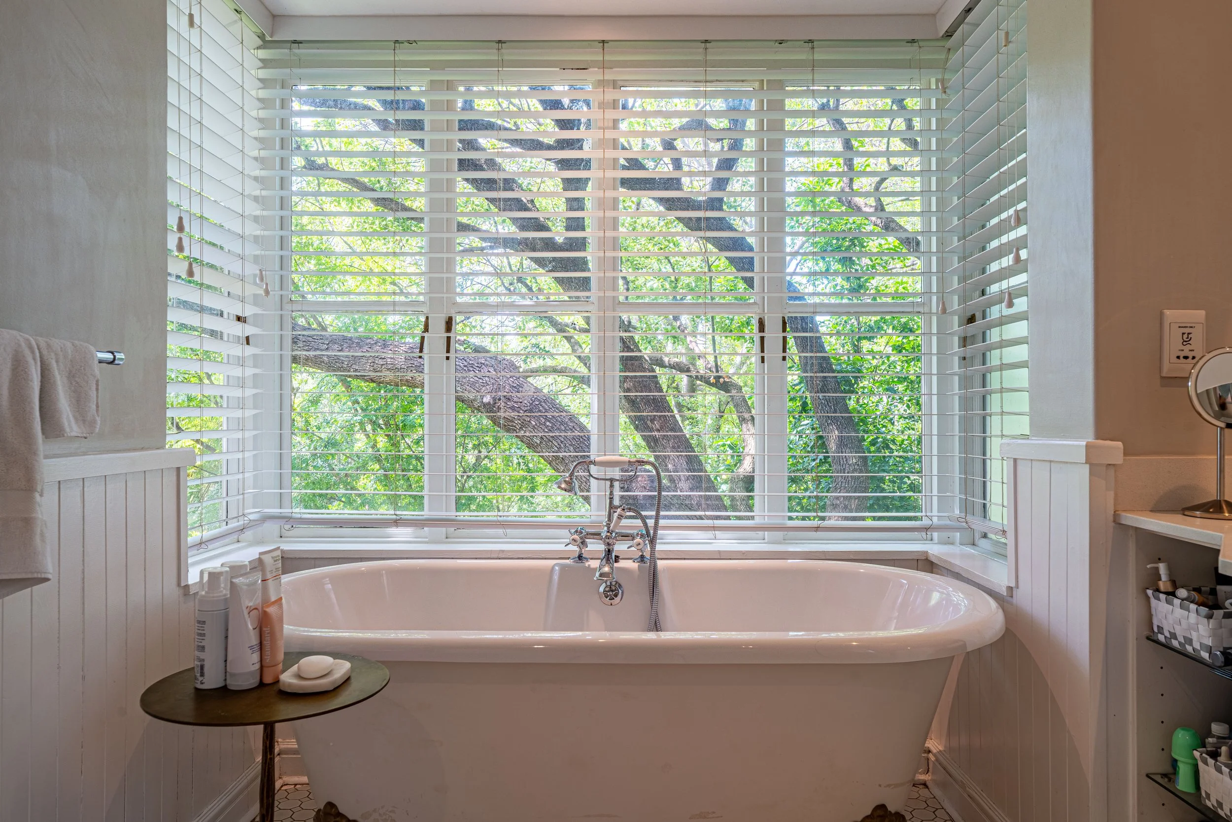 - his & hers dressing rooms, a freestanding bath framed by treetop views. This feels like you are in a game lodge in Botswana, rather than central Joburg.